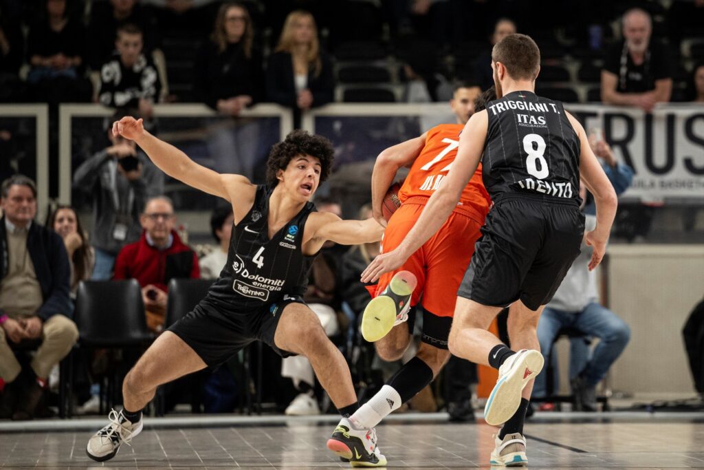 Non solo settore giovanile, però, per Machetti, che nel corso della stagione ha potuto ben presto assaporare anche il clima della prima squadra e vivere, durante la stessa, un momento decisamente speciale: “All’inizio dell’anno non immaginavo neanche che avrei potuto allenarmi con la prima squadra ed essere aggregato per il ritiro di Cles, è capitato anche a causa di alcuni infortuni ed è stato speciale, perché mi ha dato modo di conoscere anche all’esterno del campo i compagni più adulti, per quella che reputo essere l’esperienza più importante che abbia vissuto nel mondo della pallacanestro”. E il 14 gennaio arriva anche il momento dell’esordio ufficiale, nella partita casalinga di Eurocup contro Ulm, futura squadra del Bronzo europeo Under 18 Diego Garavaglia: ”L’ho scoperto con una chiamata di coach Crespi di ritorno da scuola, dicendomi di presentarmi al palazzetto alle sei. Pensavo di dover fare riscaldamento e basta, di dare un cinque ai giocatori, ma negli spogliatoi coach Galbiati è stato chiaro, mi ha detto di tenermi pronto e che avrei potuto giocare qualche minuto”. La partita si mette subito bene a favore di Trento, così il coach nel finale manda sul cubo del cambio il classe 2009: ”E’ stata un’emozione forte, nonostante mancasse solo poco più di un minuto, Anthony Lamb mi ha indicato il giocatore che avrei dovuto marcare e questo è un grande segnale di quale sia l’approccio che si debba avere, ho giocato con spensieratezza ed un sorriso che mi porterò dietro sempre: ho fatto fatica a dormire per l’adrenalina, nonostante il giorno dopo ci fosse scuola”. A 15 anni, 9 mesi e un giorno Mario è il terzo giocatore più giovane ad aver esordito in una partita di Eurocup o Eurolega.