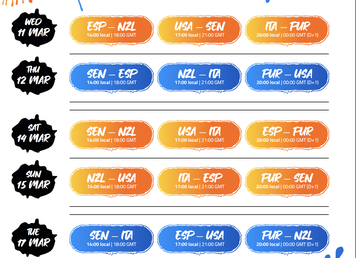 Le Azzurre esordiranno l’11 marzo con Porto Rico alle ore 20.00 (le 2.00 in Italia), il giorno dopo scenderanno in campo con la Nuova Zelanda (ore 23.00 in Italia) e poi il 14 sfideranno gli Stati Uniti (ore 23.00 in Italia). Ultimi due impegni il 15 marzo con la Spagna (ore 23.00 in Italia) e il 17 col Senegal (ore 20.00 in Italia).
