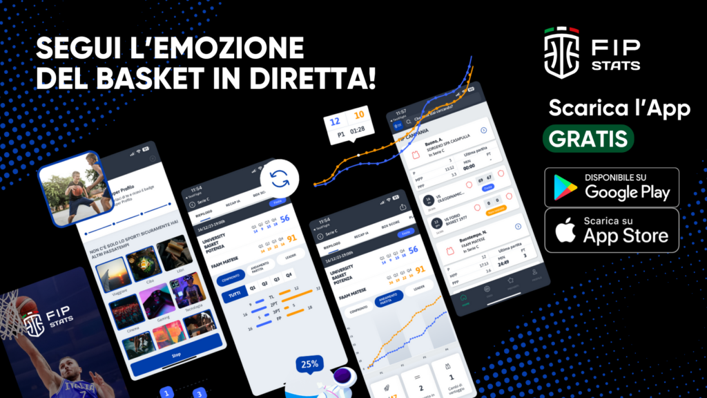 Inoltre, l’Under 19 Eccellenza è tutta da seguire su FIP Stats, con i 12 Gironi a referto elettronico e con tutte le statistiche registrate direttamente dal tavolo degli Ufficiali di Campo. Con la nuova funzionalità Profilo Unico, su FIP Stats sono poi visibili gli storici dei giocatori e delle giocatrici digitalizzati già nelle scorse tre stagioni sportive. Per scaricare FIP Stats clicca qui.